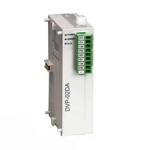 DVP02DA-S دو خروجی آنالوگ ولتاژی/جریانی ارائه میکند تا فرماندهی به اینورترها، ولوهای کنترلی و تجهیزات اندازهگیری امکانپذیر شود. دارای مدهای ولتاژ 0–10V و جریان 4–20mA است و در سمت راست CPU نصب میشود.