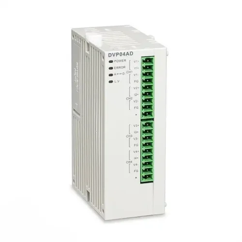ماژول ۴ ورودی آنالوگ DVP04AD-SL با دقت بالاتر (۱۶ بیت) و نصب سمت چپ؛ مناسب کاربردهای حساس. گسترش از سمت چپ.