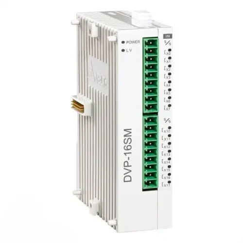 ماژول ورودی دیجیتال 16 کاناله مدل DVP16SM11N برای دریافت سیگنالهای 24VDC؛ نصب گسترش از سمت راست.