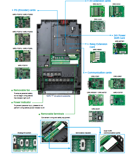 اینورتر دلتا سری C2000 با طراحی ماژولار ساخته شده است. این ویژگی باعث میشود نصب و تعمیر دستگاه بسیار سادهتر باشد و در صورت نیاز بتوان بهراحتی کارتهای توسعه مانند I/O، ماژولهای شبکه و کارت فیدبک PG را به سیستم اضافه کرد